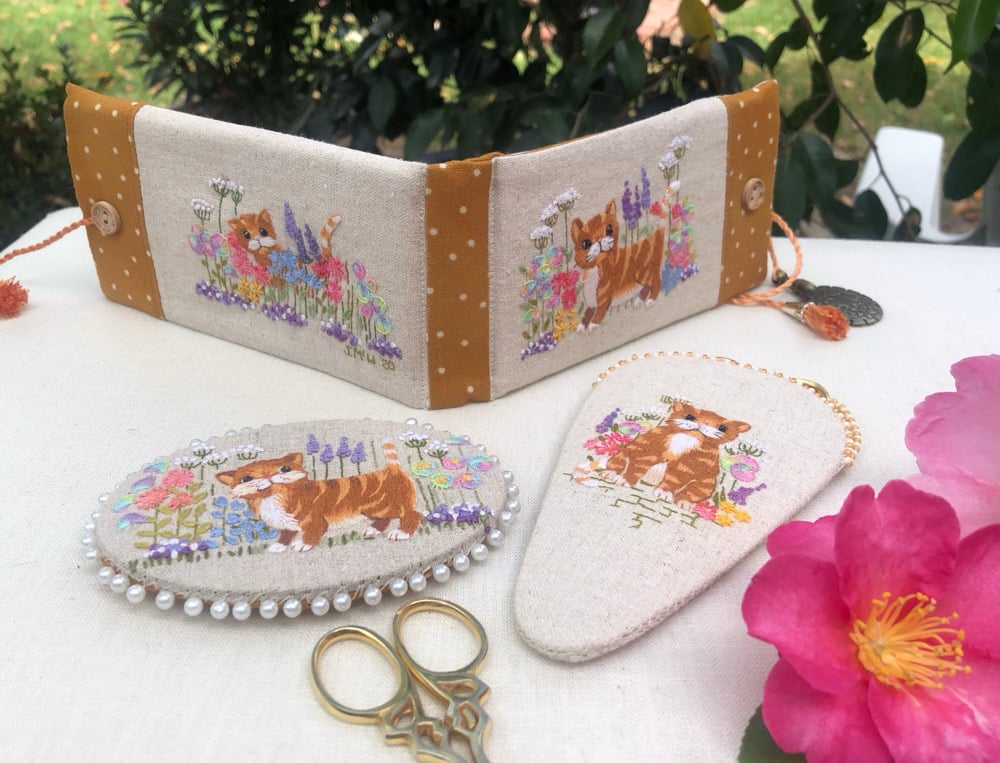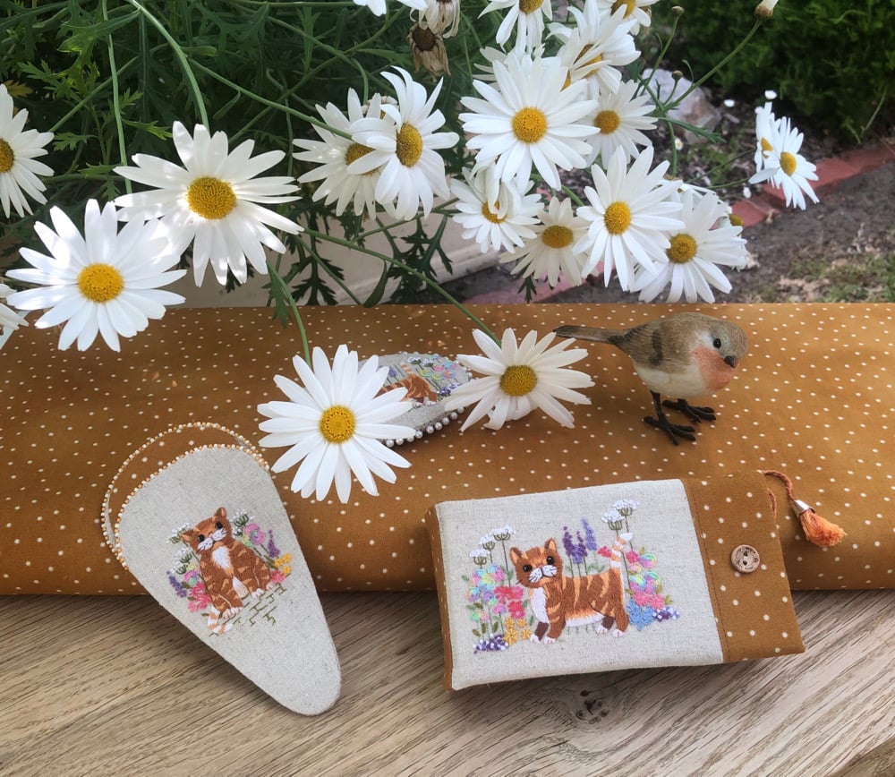 Embroidered on this handy scissor keep, Basil the playful kitten sits in a garden English wildflowers.