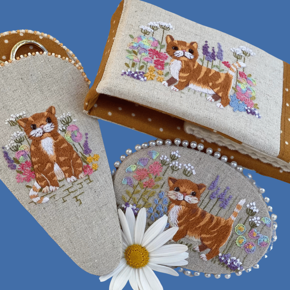 Worked on a natural toned cotton/linen, this enchanting project is inspired by Jenny’s ginger British shorthair cat, Basil, who brought many years of joy & fun.