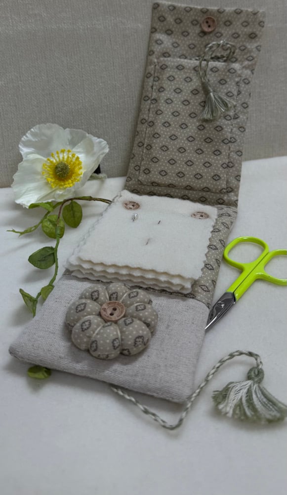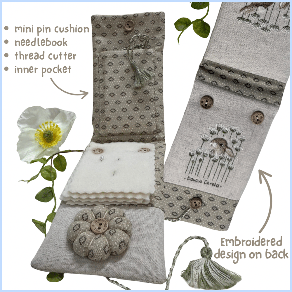 Stitched in stranded cotton on linen with contrasting backing fabric to match - selected by Jenny to perfectly compliment her design. Featuring a built in needle book, attached pincushion & pocket to house the included circular thread cutter, adorned with a twisted thread & tassel.