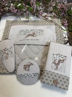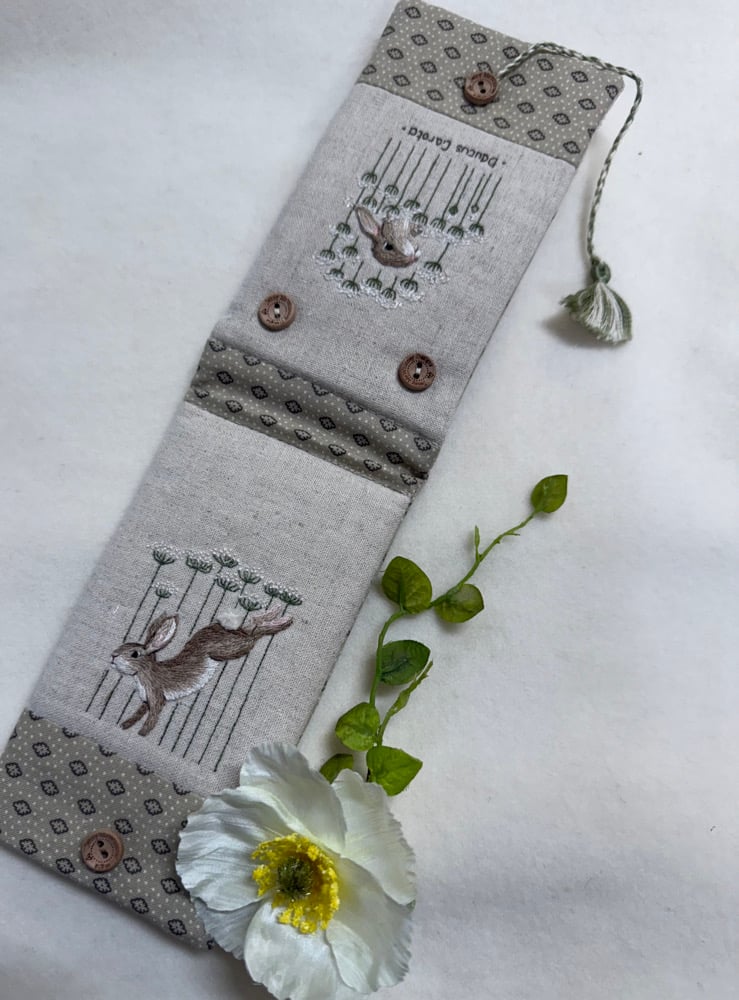 Adorned with a regal bunny playing in a field of Queen Anne’s Lace, this natural toned linen work station will make a wonderful addition to your sewing kit, especially when you are on-the-go!