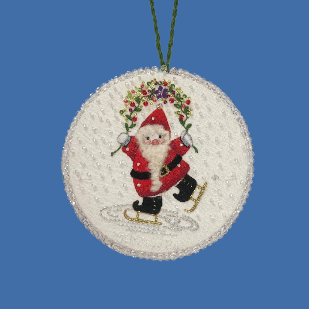 Worked on a natural toned linen, this sparkling stitched ornament will make a joyous addition to your Christmas tee.